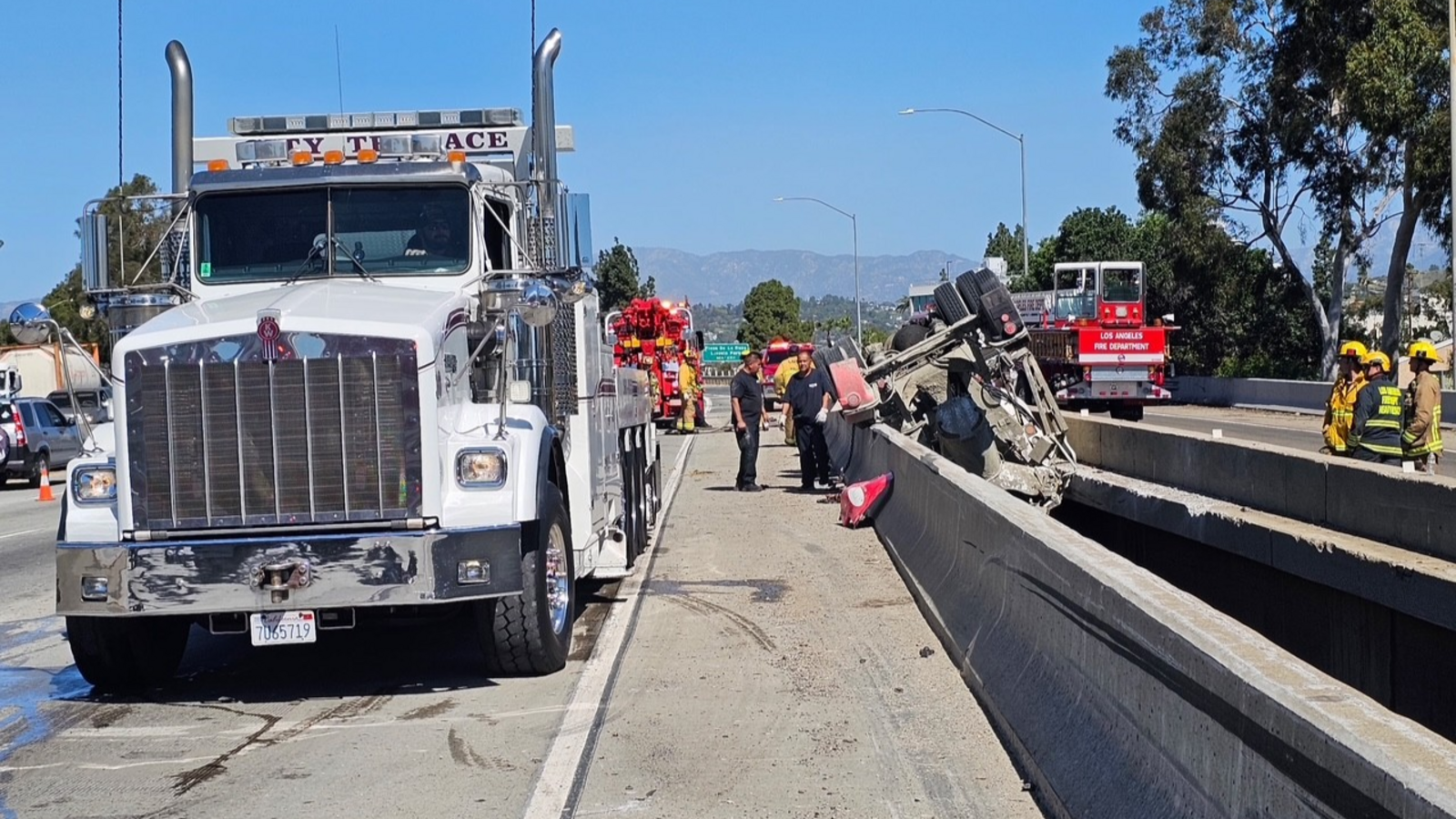 • Concrete truck overturns on transition road in Boyle Heights, spills payload and dangles above 10 Freeway